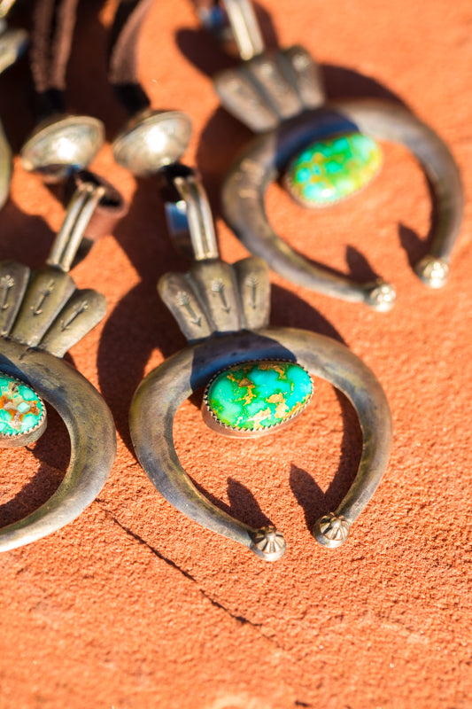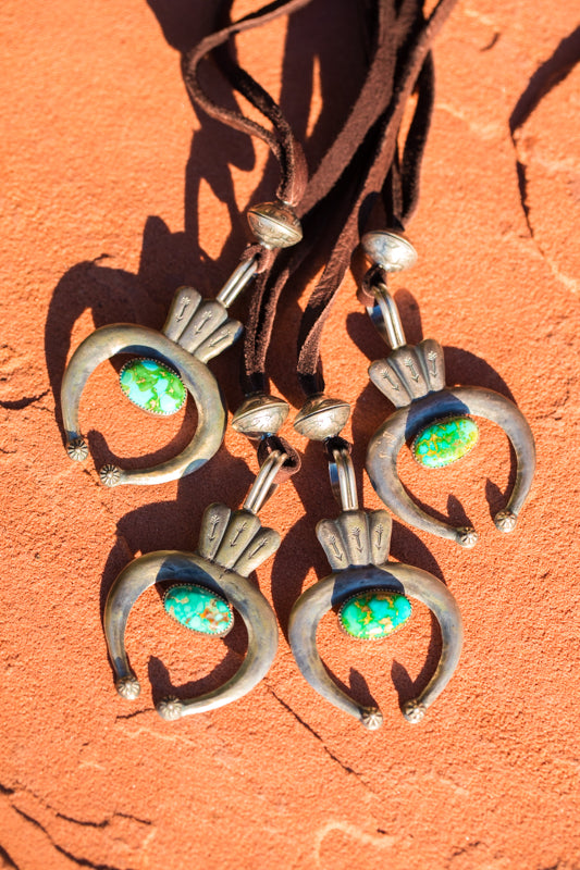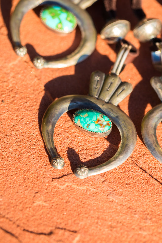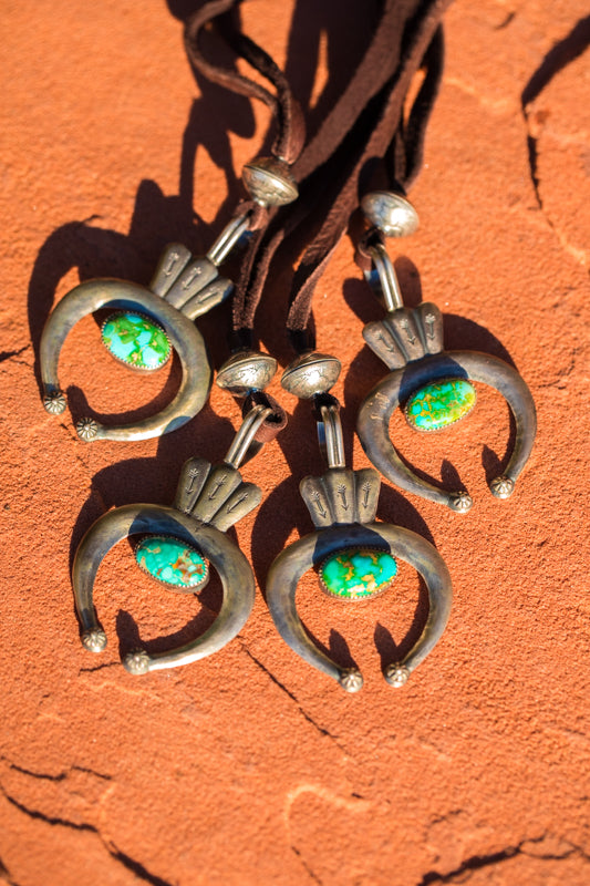The Naja is a crescent-shaped piece that is often worn alone as a pendant or as the center piece of a squash blossom necklace in Southwestern Indian jewelry. The brilliance of these turquoise stones, produce amazing work of art. Ingot style jewelry is formed by melting old coin into a bar, pounding it out into shaped jewelry and hand finishing in several steps of buff and polish. Jessie owns his own turquoise mine, called the Cheyenne mine, with brilliant greens and blue tones. These look AMAZING with our Jesse blossom pendants! Topped with a coin "Navajo Pearl" on 32 inch deerskin. These are under three inches by 2.5 inches