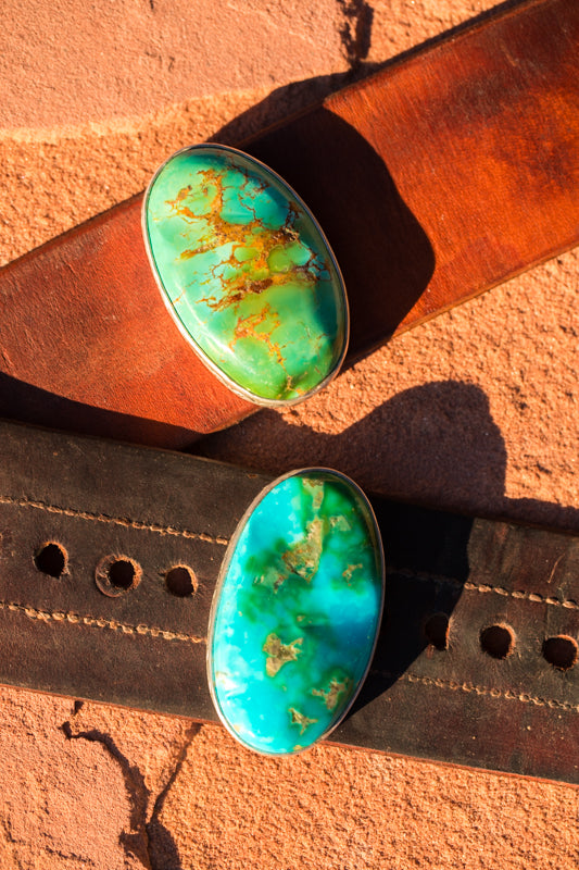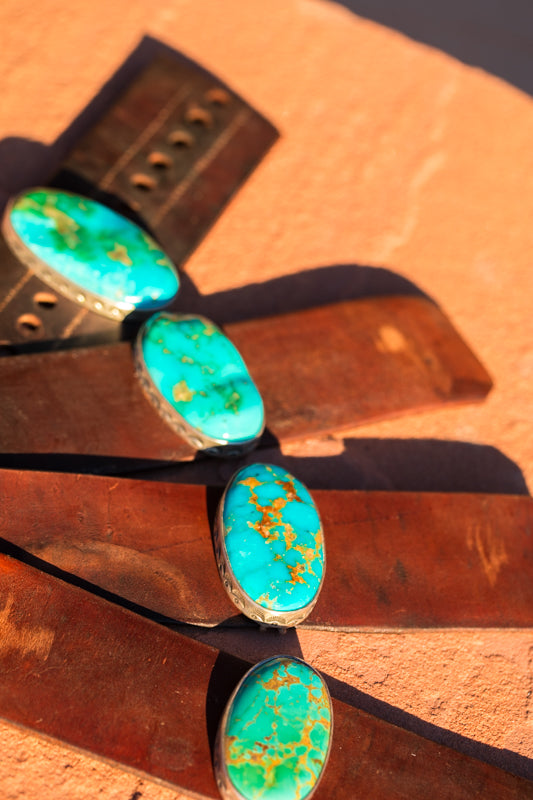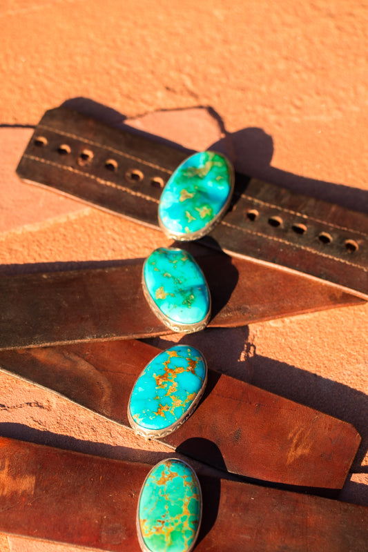Mas Grande cuff! We only cut the most beautiful and interesting natural American turquoise for these. Each bezel is hand cut, stamped in traditional Navajo stamps, placed on sterling silver and premium vintage leather. The size of these stones are rare due to the massive amount of rough and the huge veins of turquoise they take to produce. They must be of a very naturally stable nature to endure the cutting process. Choose between green or blue tones, a lot or a little copper matrix. Please contact us for photos of actual available product. Mas Grande Stones are sized around 3 inches by 2 inches.