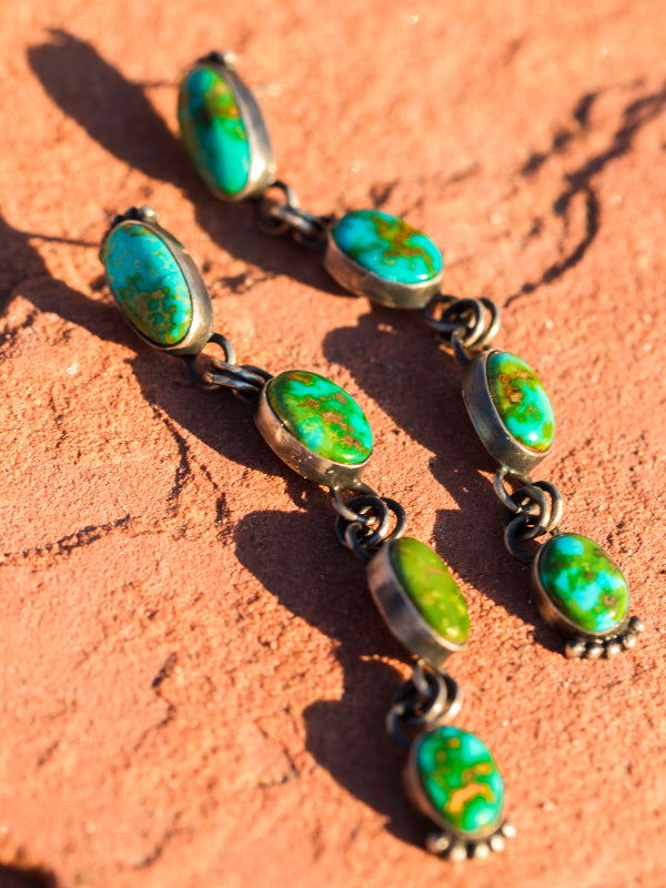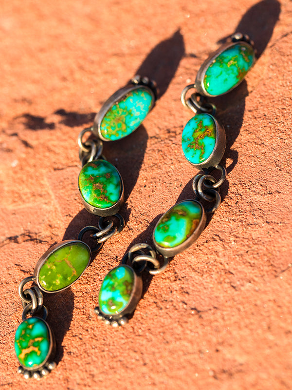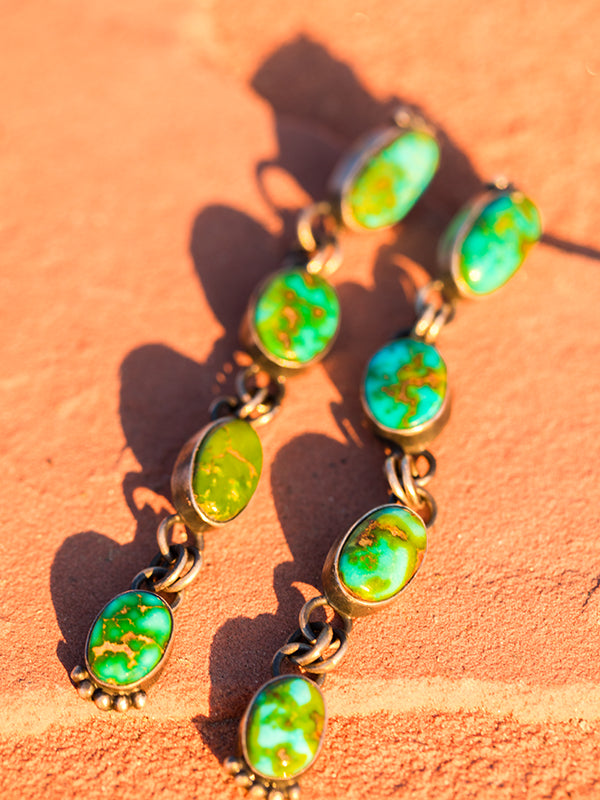 Beautiful Sonoran gold in its amazing color variety. A beautiful waterfall earring, four stones of Sonoran Gold Turquoise. I mix fun blues and greens in mostly oval shapes, Sonoran is known for its beautiful greens! These are very popular, and always unique. Each piece an individual, colors and size vary. We do our best to stock, please contact if you are in a rush.