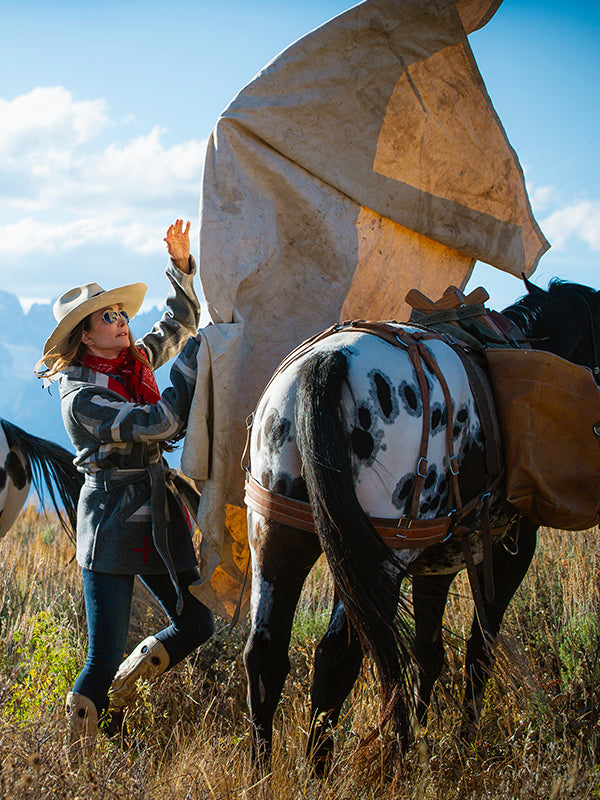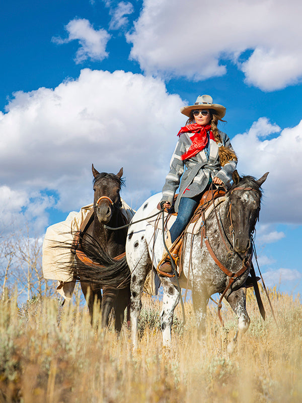 Created with the USA made Pendleton® San Miguel wool blanket, our short wrap coat proudly shows off the beautiful gray tones with ivory and red crosses of the popular blanket design. The bold crosses and minimalist colors of the blanket design were inspired by the influence of 19th century Spanish missionaries on Southwest weaving. Wear it open or close it with the belt. Please contact if in a rush, we do stock inventory but have to occasionally make sizes that sell at shows.