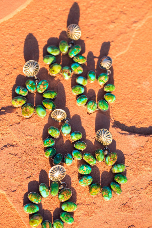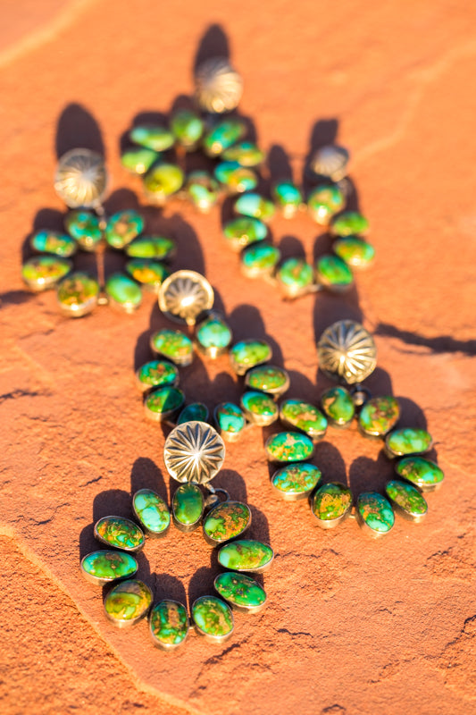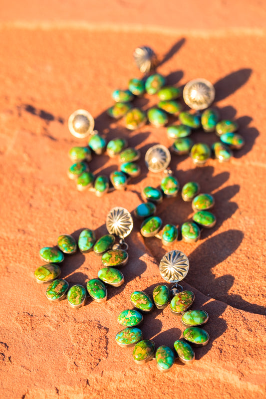 A perfect circle in beautiful colorful Sonoran turquoise. Typically called a Chandelier style earring, I have added my favorite Concho to match up with our beautiful Waterfall Necklaces and pendants. We are custom building these as fast as we can, and keep a great stock of a variety of pieces.