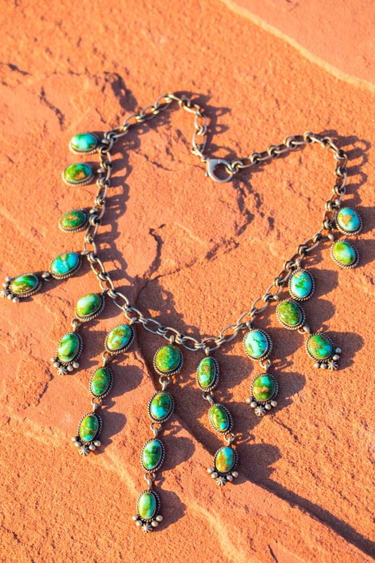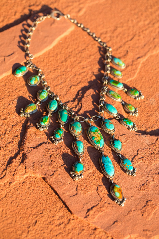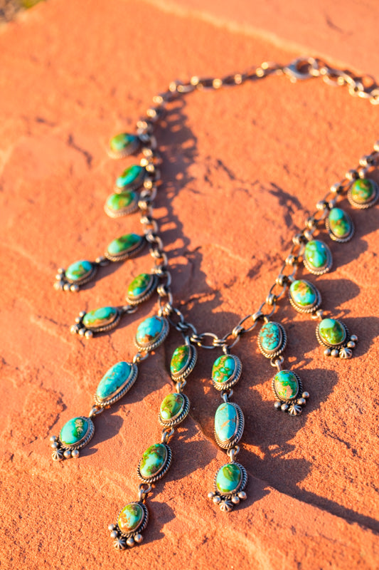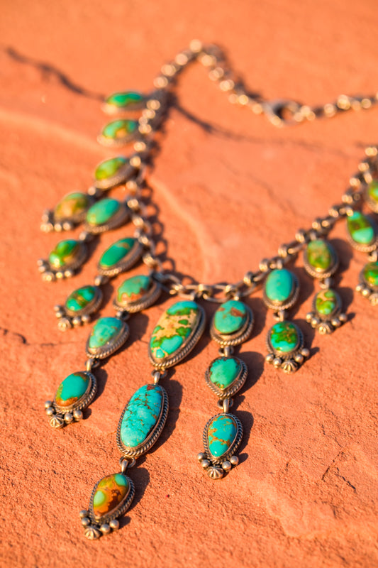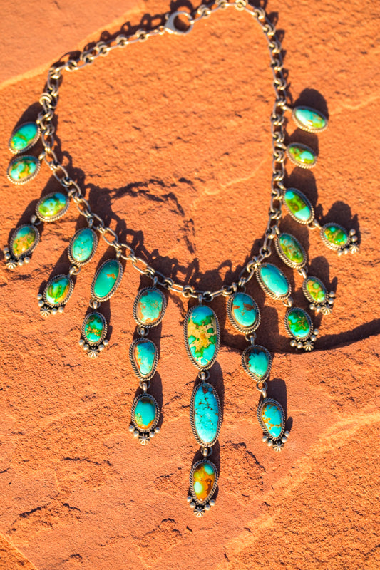 This was one fun necklace to build and one of my favorite items to shoot! These necklaces showcase Sonoran turquoise, in a beautiful mix of bright blue, forest greens and brilliant copper. Can be worn as a choker or 22 inch long necklace with the 4 inch fall reaching about 26 inches on the longest setting. These are all handmade, down to the chain, just amazing works of art. Hand-picked to create a unique, heirloom quality piece that you will enjoy for years to come. Gem quality turquoise set in sterling silver and linked together to lay harmoniously around your neck.