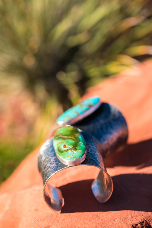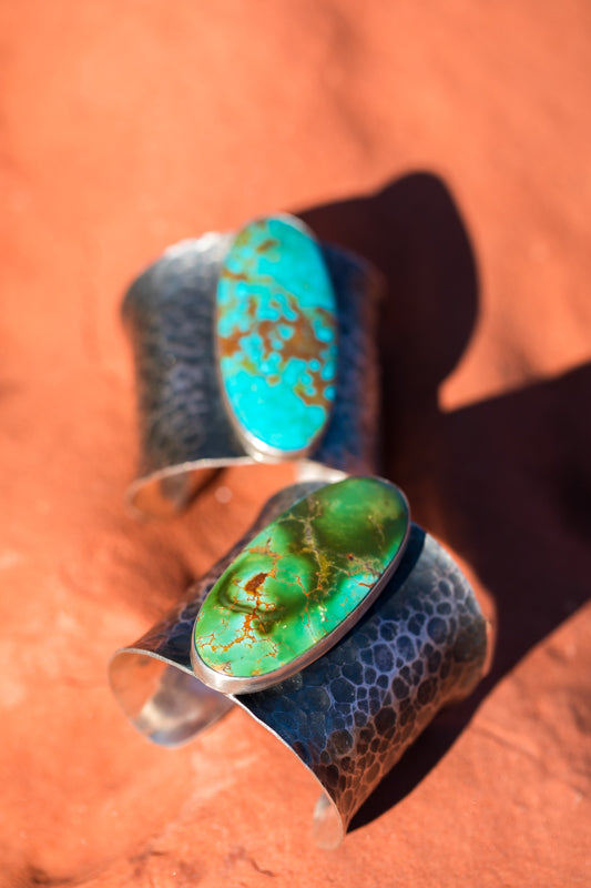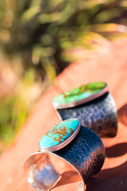 Hand forged hammered sterling silver. Each an individual work of art! We make these all custom, and stone sizes vary. Beautiful seafoam and copper oval centers. Comfort fit cut with tapered edges. Heavy antiquing with beautiful hammered surface. I love these for a dressier option than leather.