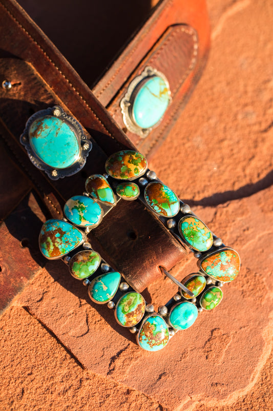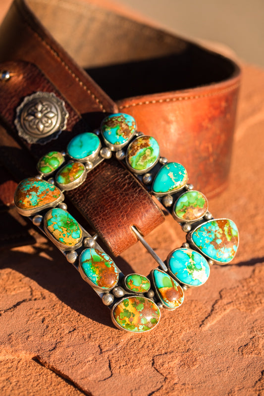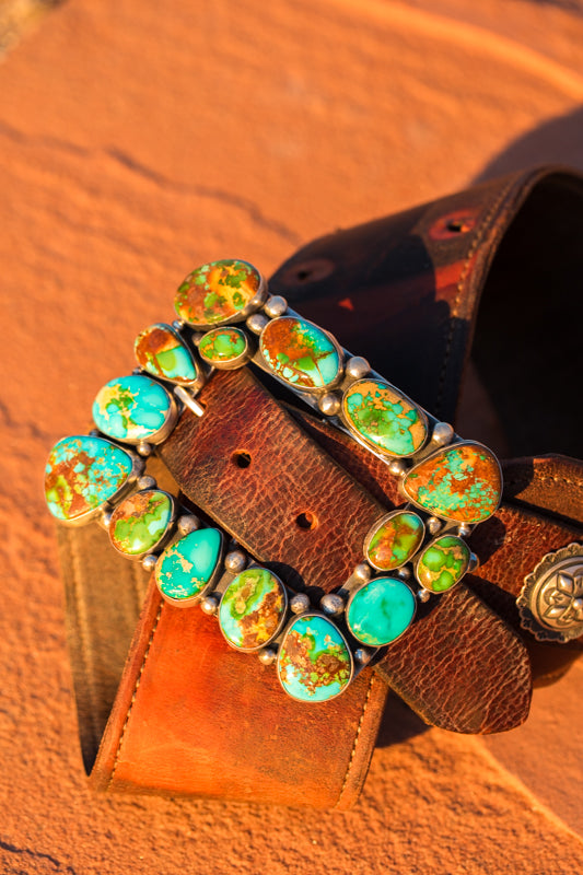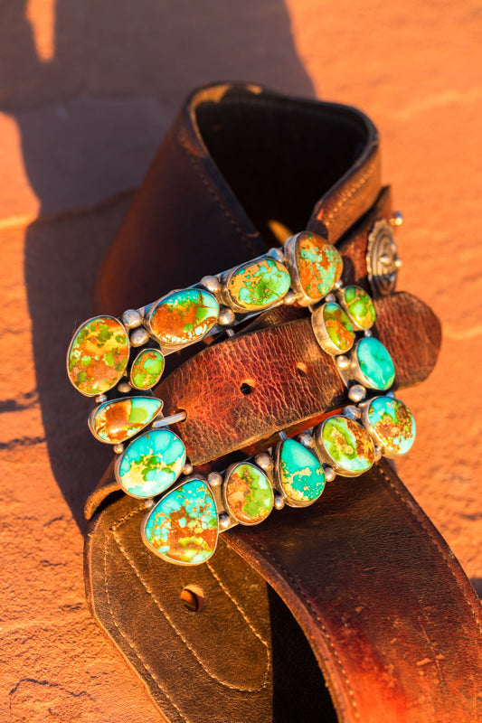 Teton frame of sterling silver, turquoise and spots, what a perfect buckle for any occasion! I wear this everyday with a vintage leather spot or old coin belt. Each spot is hand formed and the stone is soldered on to a substantial sterling silver backing. Will fit up to1 1/2 or 1 3/4 inch belt width. They range between 3 inches tall and about 4 to 4.5 inches wide. The width of the stone or quality denotes the size, I might have to produce these custom for you, estimated delivery is 4- 6 weeks.